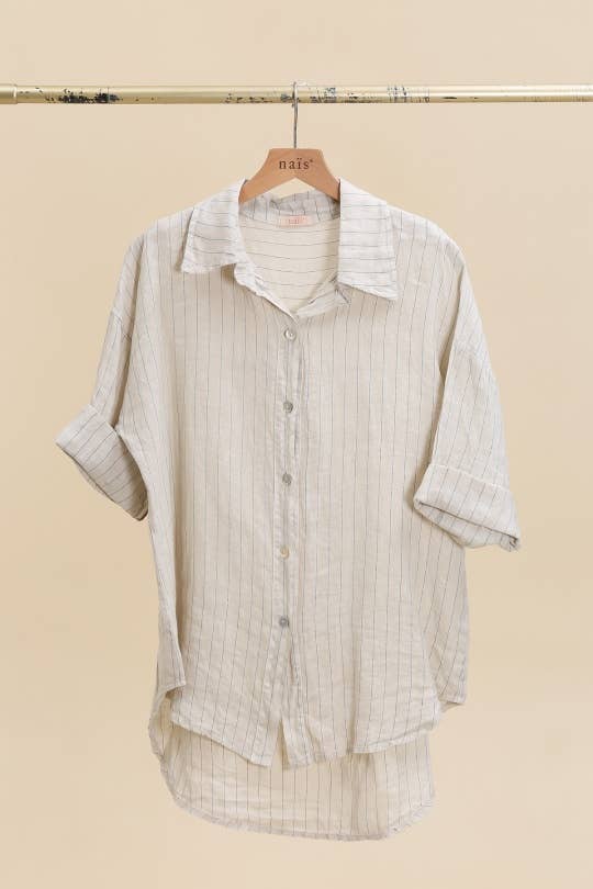 3/4 SLEEVE STRIPED LINEN SHIRT: Sky Blue / One size