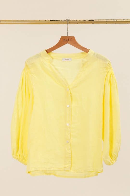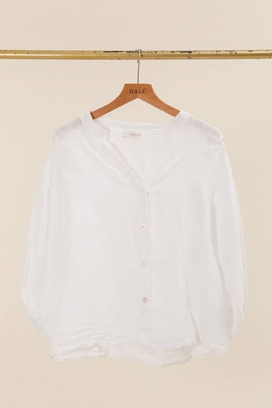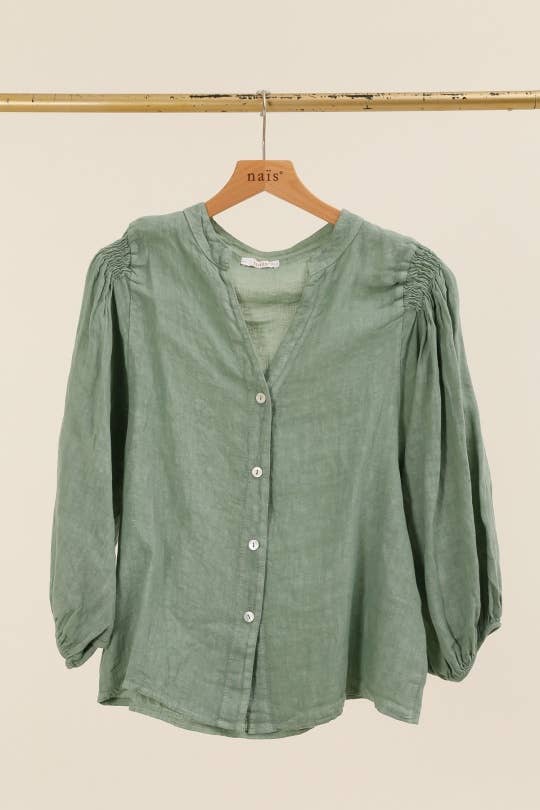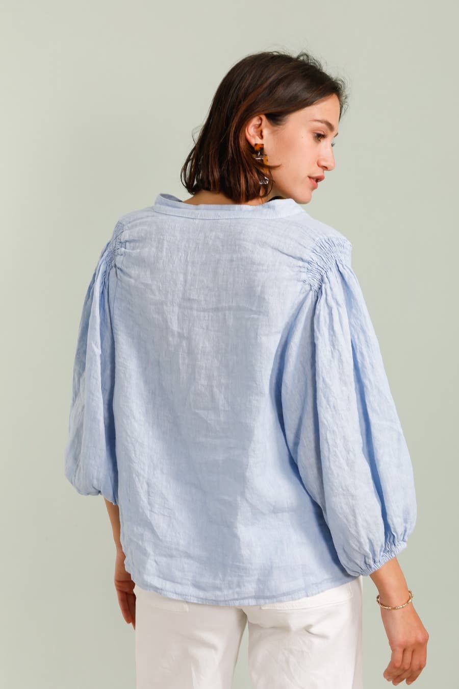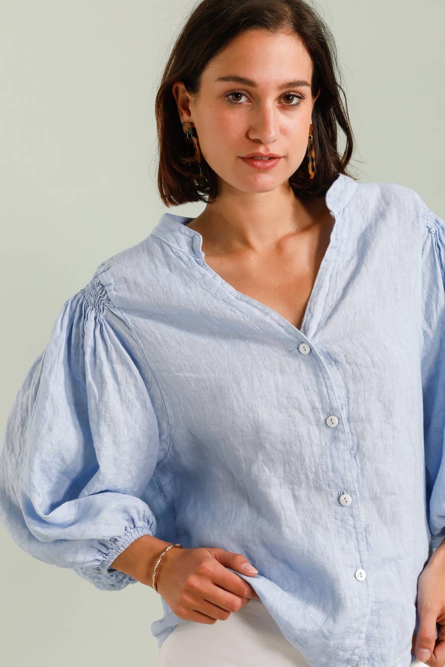 Add a touch of freshness to your wardrobe with this linen blouse, both feminine and full of character. Made from soft, natural linen, it charms with its elegant puff sleeves and gathered shoulder details that add a romantic note to your look.