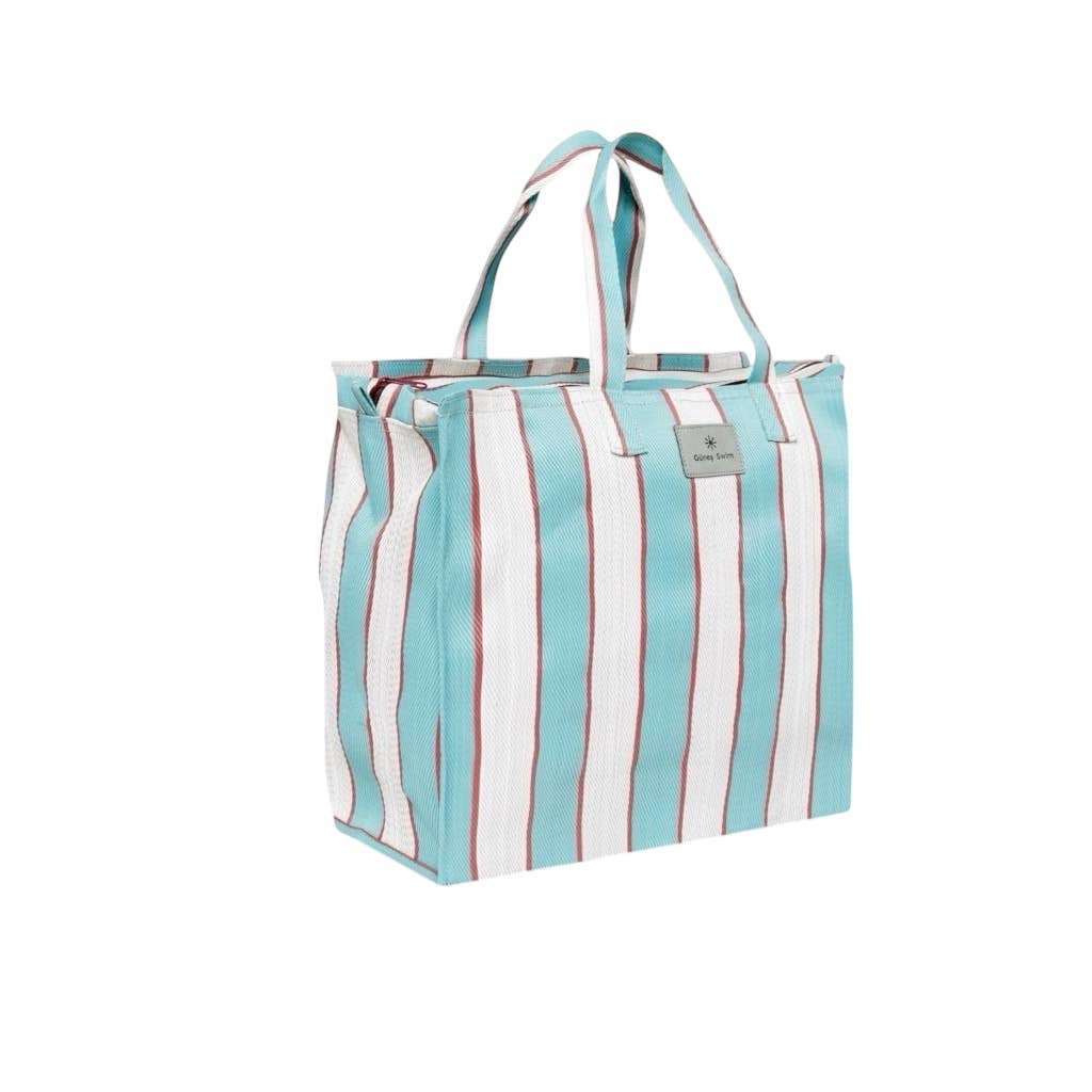 With its bold stripes and spacious, boxy design, this tote will become your essential summer accessory, whether you're headed to the beach or simply enjoying a stroll through the city. Made in India Recycled nylon  Internal pocket Medium - 39cm l x 37cm W Large - 41 cm l x 48cm W