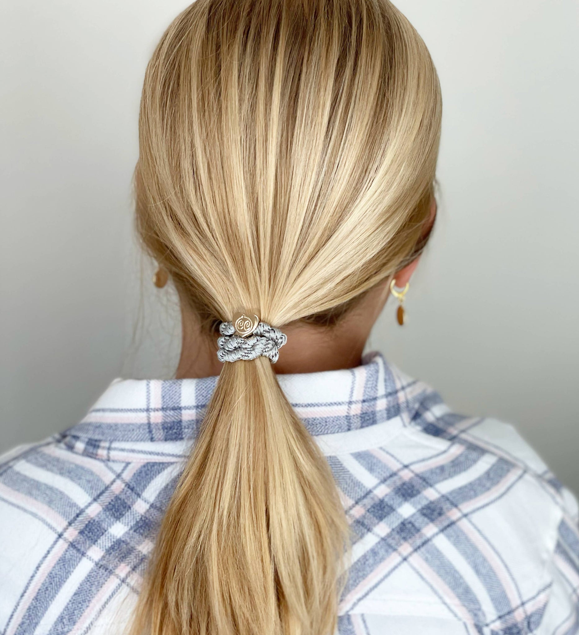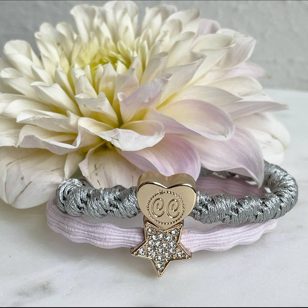 Charm your hair and wrist with our Gold Heart - Silver Grey hair tie. This Charms by Charlotte creation features a gold heart charm on a silver grey band, giving you the perfect balance between strength and style. Inspired by high-end fashion and European boutique designs, this hair tie is not just a practical tool, but also a fashionable accessory. It's gentle on your hair, ensuring your ponytail stays in place without any discomfort. Elevate your hair game with Charms by Charlotte.