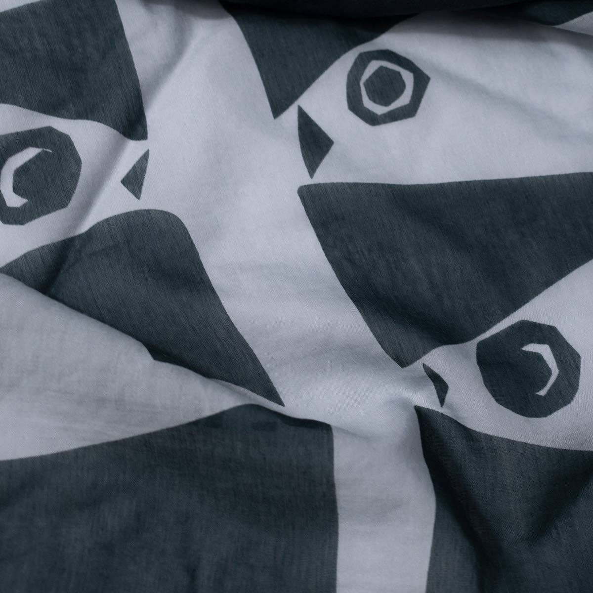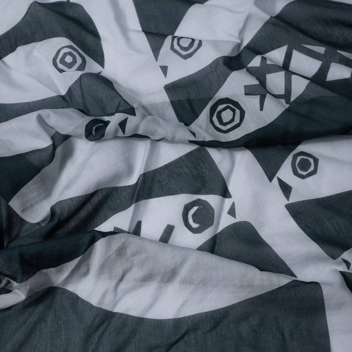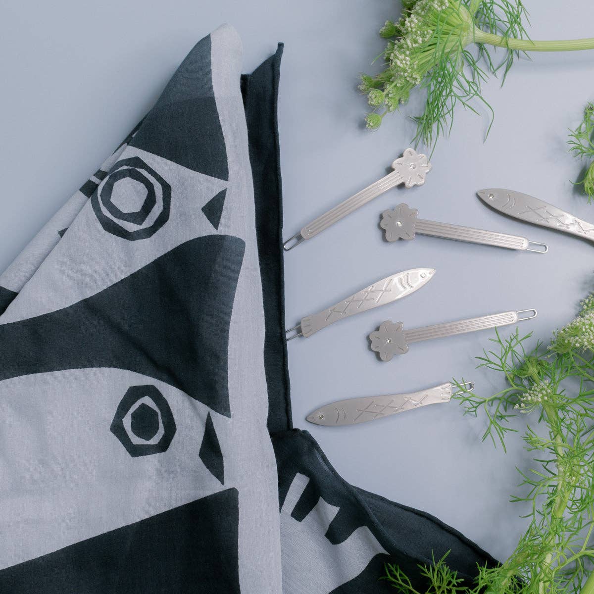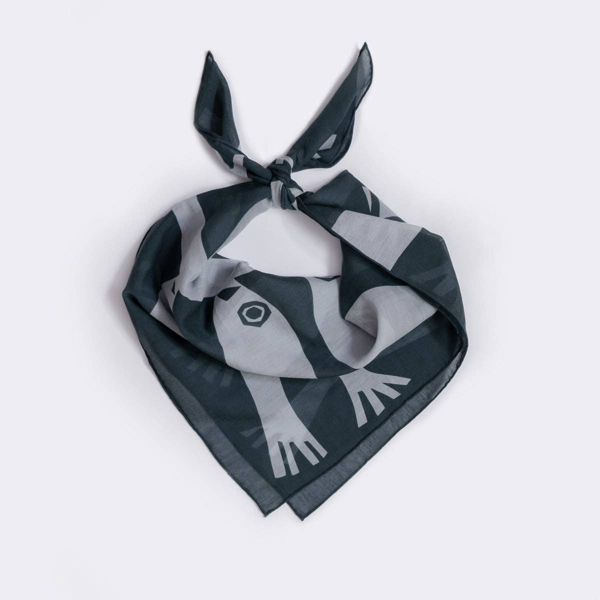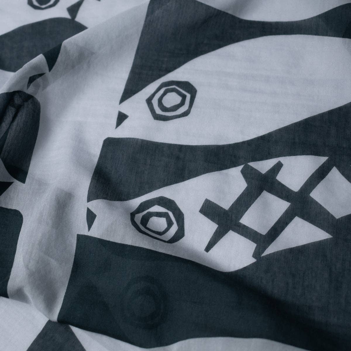 A glint of silver quickly disappears into the steel blue sea. A design inspired by both Japanese Koinobori blowing in the breeze, and schooling sardines moving gracefully through the ocean. Grey-blue tones evoke a misty morning out on the deep sea. This scarf is made from a cotton silk blend, so it has the everyday wearability of cotton with the luxury and subtle sheen of silk.