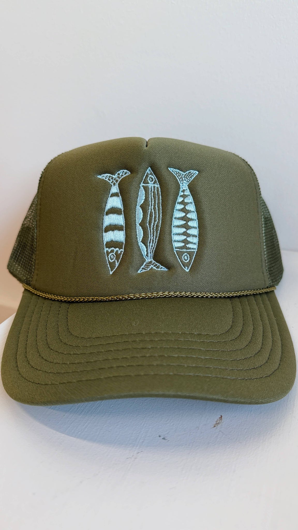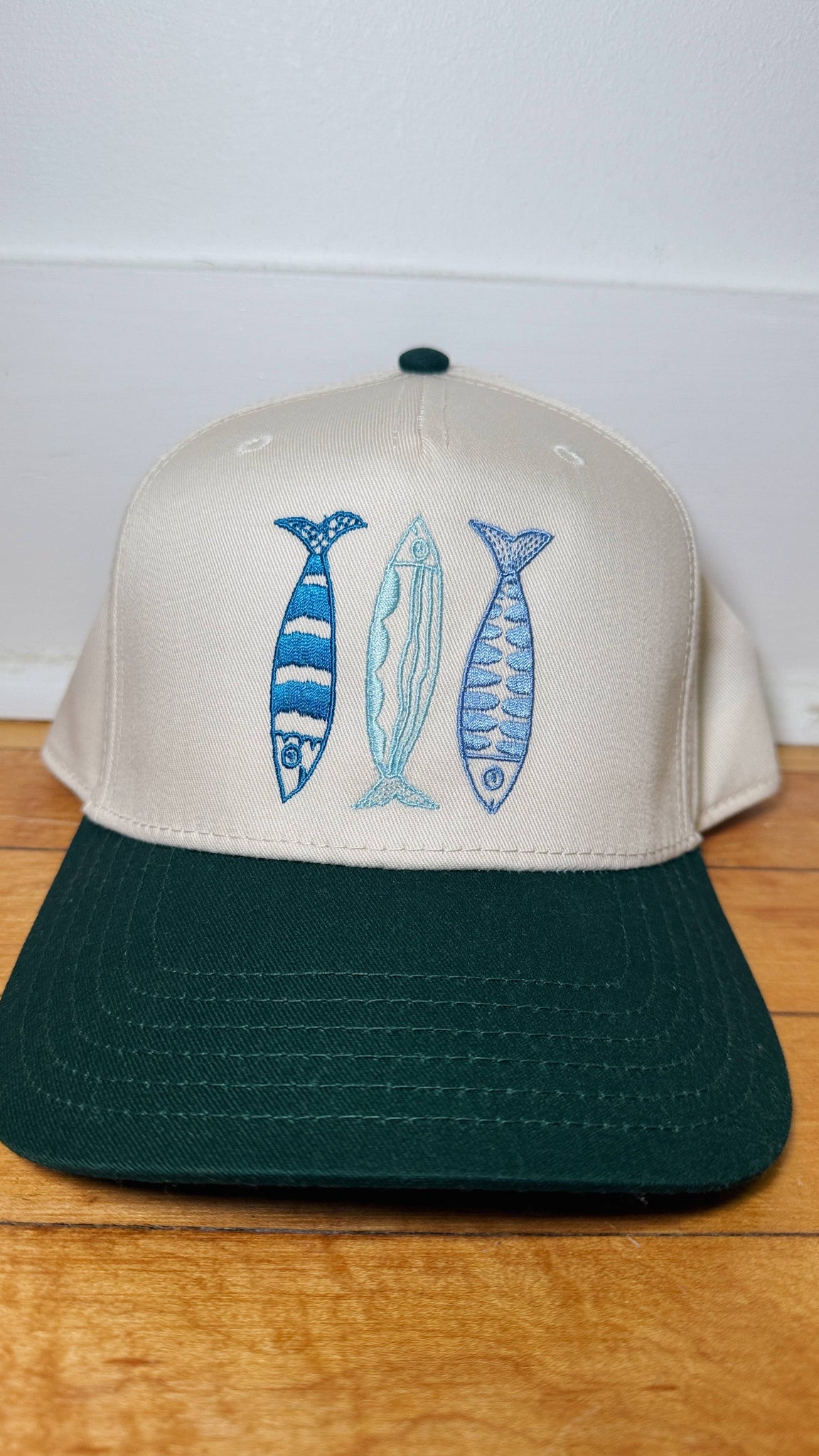 Sardine Trucker Hat: Tan hat | light blue green + blue thread