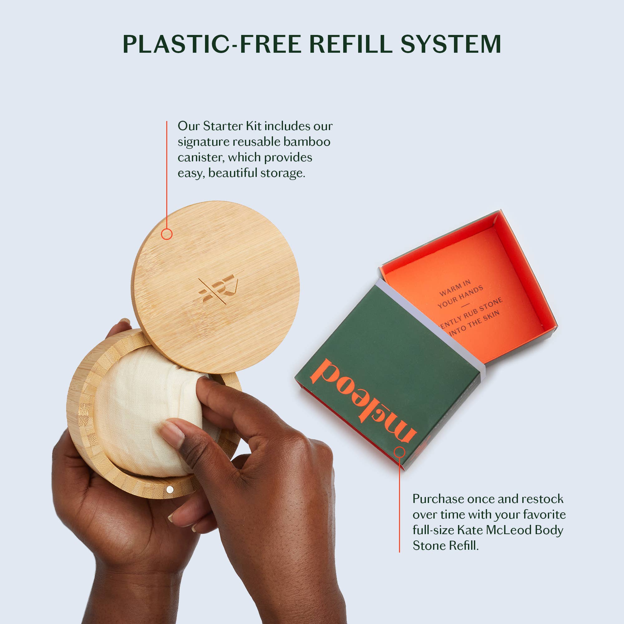 Plastic-Free Refill System: Our Starter Kit includes our signature reusable bamboo canister, which provides easy, beautiful storage . Restock your canister over time with your favorite Body Stone Refill.
