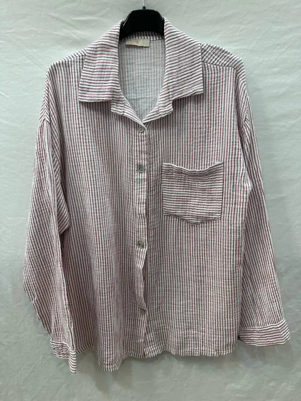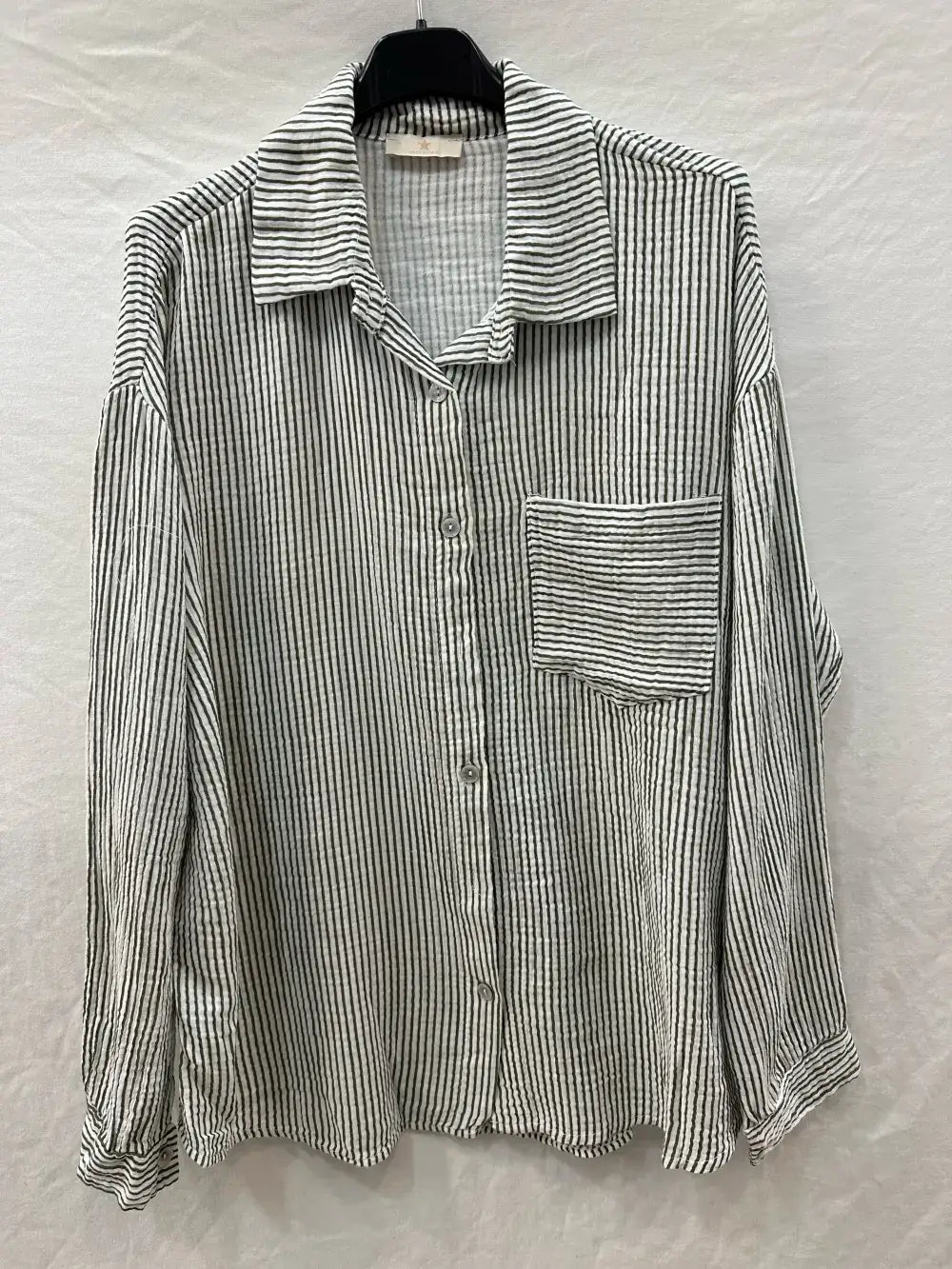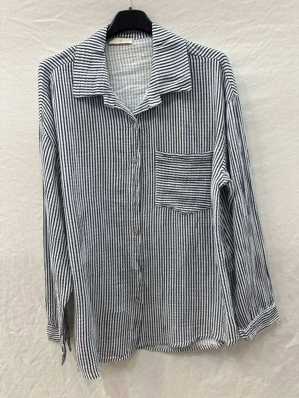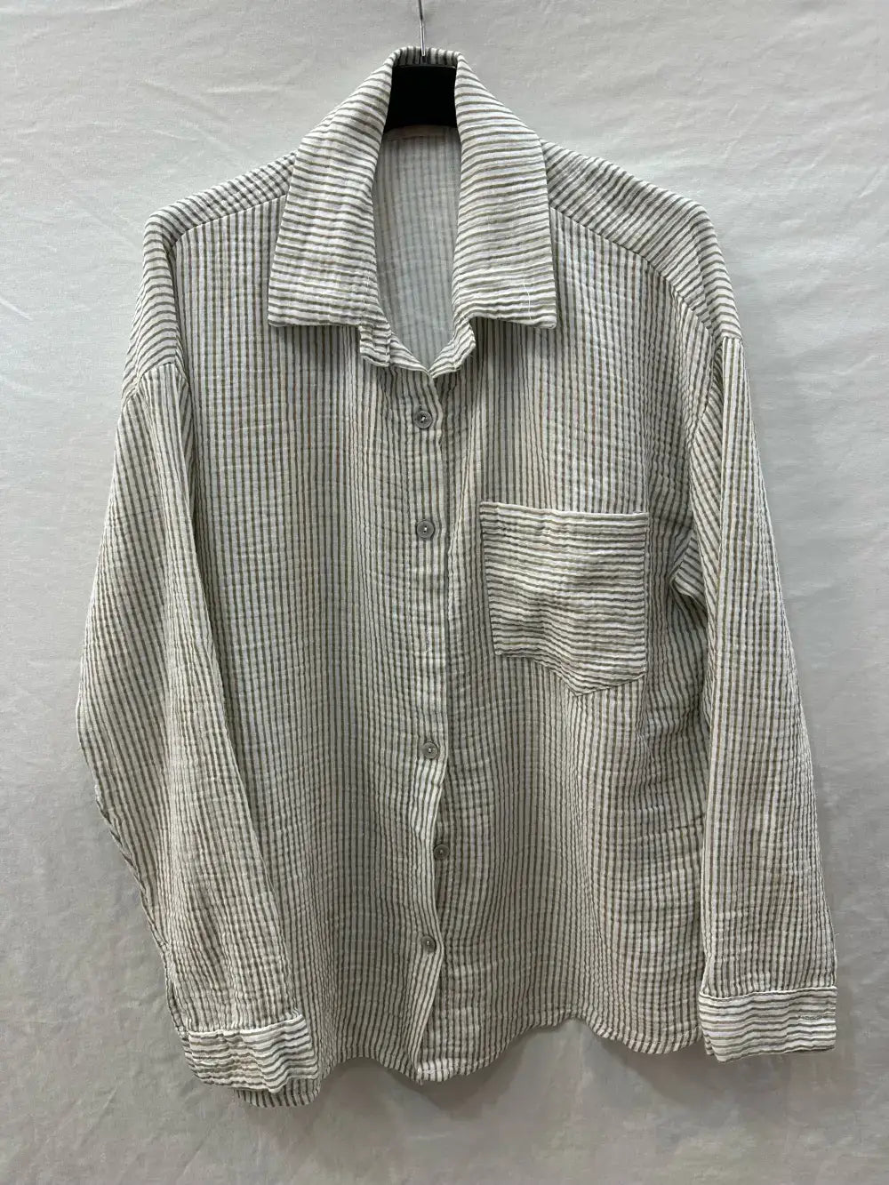Light and airy, this 100% cotton gauze shirt is perfect for a casual style. Loose fit with vertical stripes, classic collar, long sleeves, and a practical chest pocket. Comfortable and easy to wear.